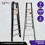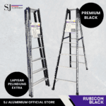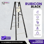 Tangga aluminium lipat tipe Rubicon 2 meter dengan desain jumbo dan warna hitam elegan, kuat, stabil, dan ideal untuk berbagai kebutuhan rumah tangga hingga profesional.
